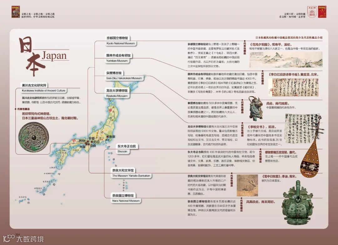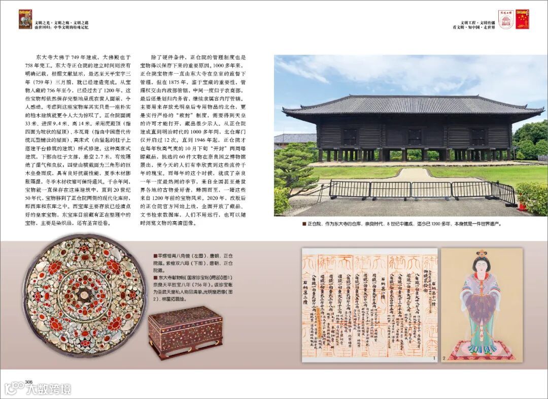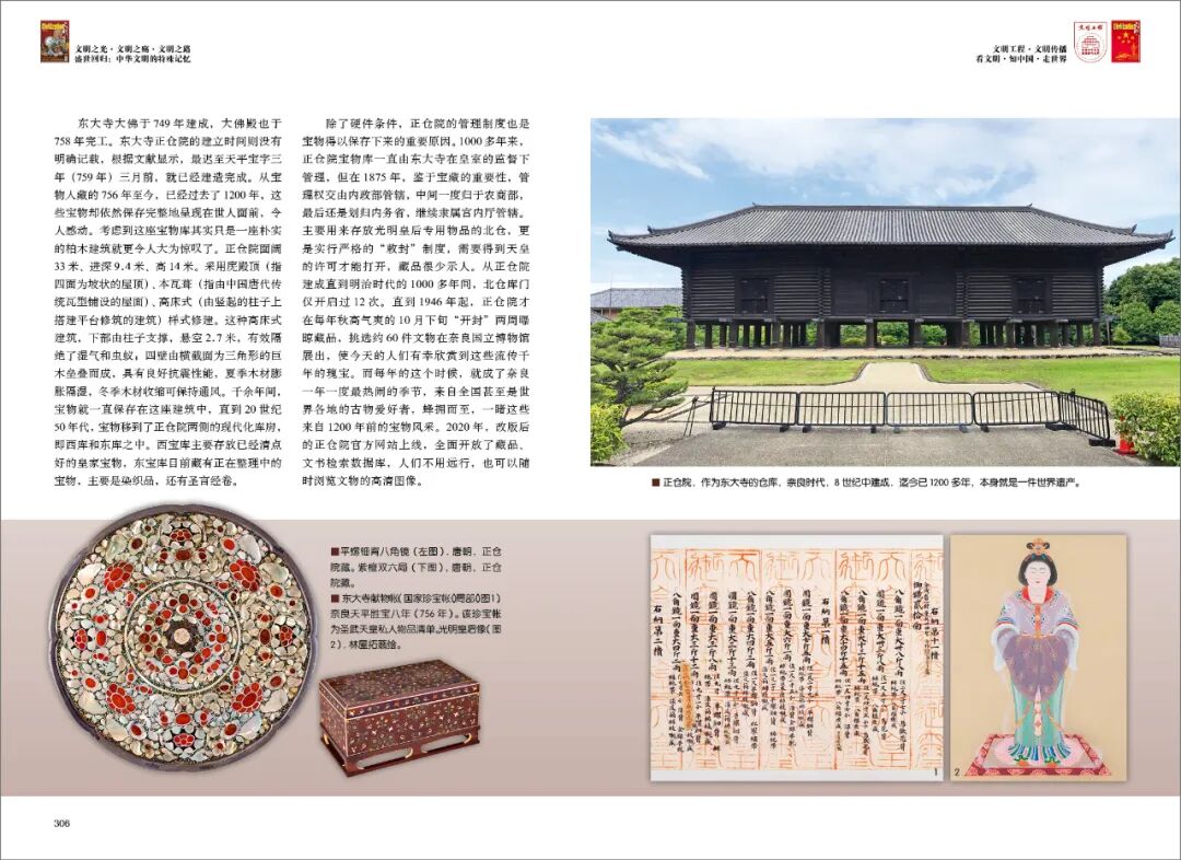 日本保存中国文物最知名的地方非东大寺的正仓院莫属。在奈良和平安时代,日本中央和地方政府机关以及主要寺庙都设有仓库来存放重要物品。许多正仓建筑聚集的地区被称为正仓院。然而,随着时间的推移,遍布各地的正仓最后都消失了,只有东大寺正仓院建筑内的正仓仍保留着过去的样子。