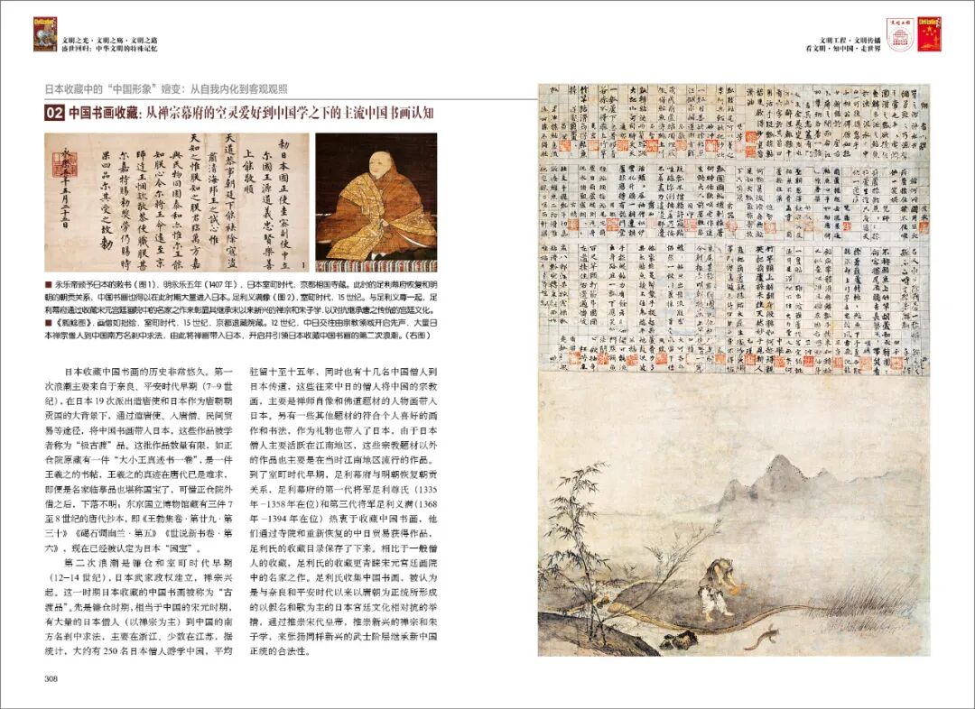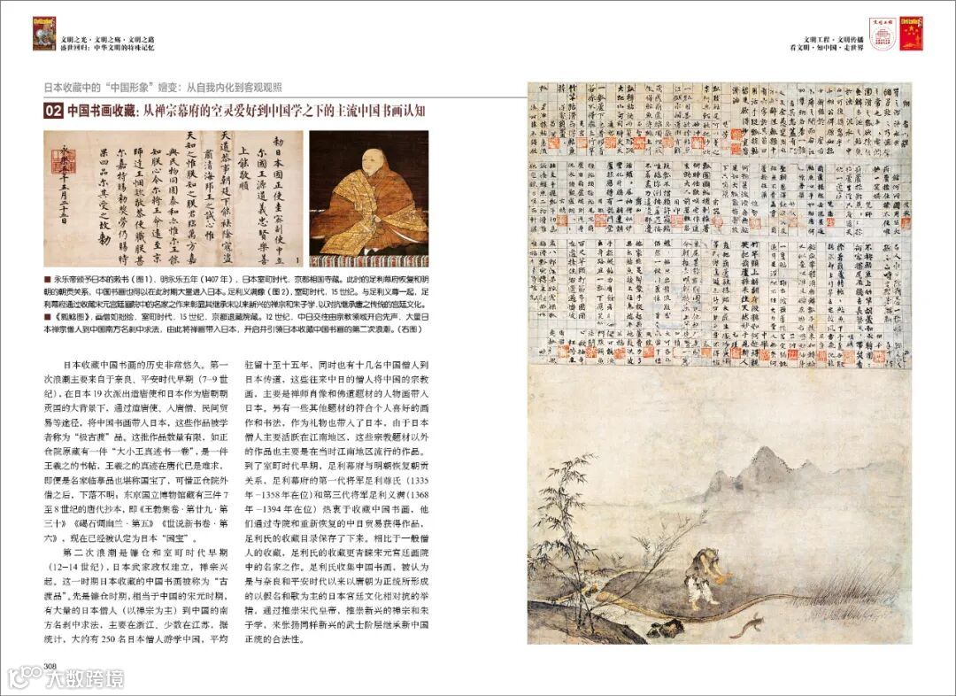 到了室町时代早期,足利幕府与明朝恢复朝贡关系,足利幕府的第一代将军足利尊氏和第三代将军足利义满热衷于收藏中国书画,他们通过寺院和重新恢复的中日贸易获得作品,足利氏的收藏目录保存了下来。相比于一般僧人的收藏,足利氏的收藏更青睐宋元宫廷画院中的名家之作。足利氏收集中国书画,被认为是与奈良和平安时代以来以唐朝为正统所形成的以假名和歌为主的日本宫廷文化相对抗的举措,通过推崇宋代皇帝,推崇新兴的禅宗和朱子学,来张扬同样新兴的武士阶层继承新中国正统的合法性。