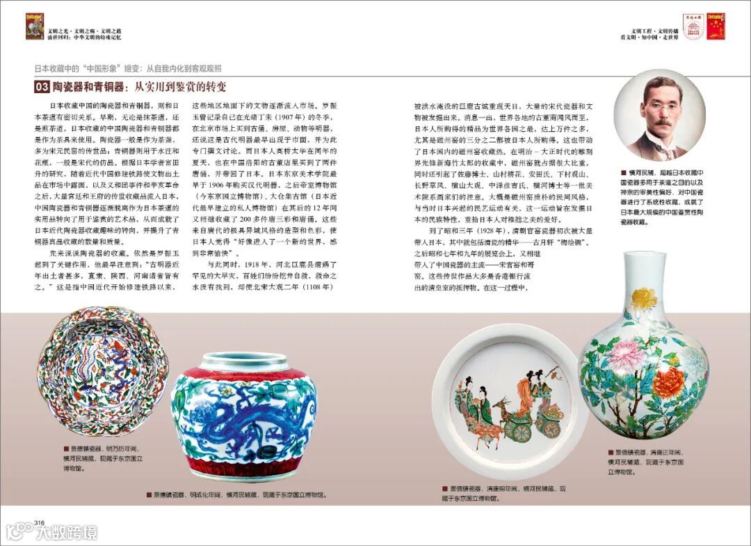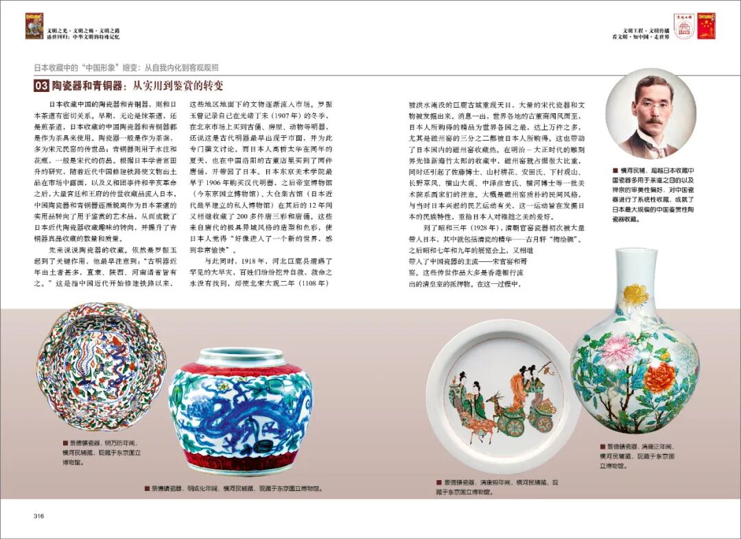 到了昭和三年(1928年),清朝官窑瓷器初次被大量带入日本,其中就包括清瓷的精华——古月轩“梅绘碗”。之后昭和七年和九年的展览会上,又相继带入了中国瓷器的主流——宋官窑和哥窑。这些传世作品大多是香港银行流出的清皇室的抵押物。在这一过程中,横河民的收藏颇具代表性,覆盖了以上提及的从汉、六朝、唐代发掘的明器,到宋元的单色瓷器,及至明青花、五彩,清的单色瓷器、粉彩,约有藏品5000件。1932年后,前后七次,横河向东京国立博物馆捐赠中国陶瓷器共计1100余件。