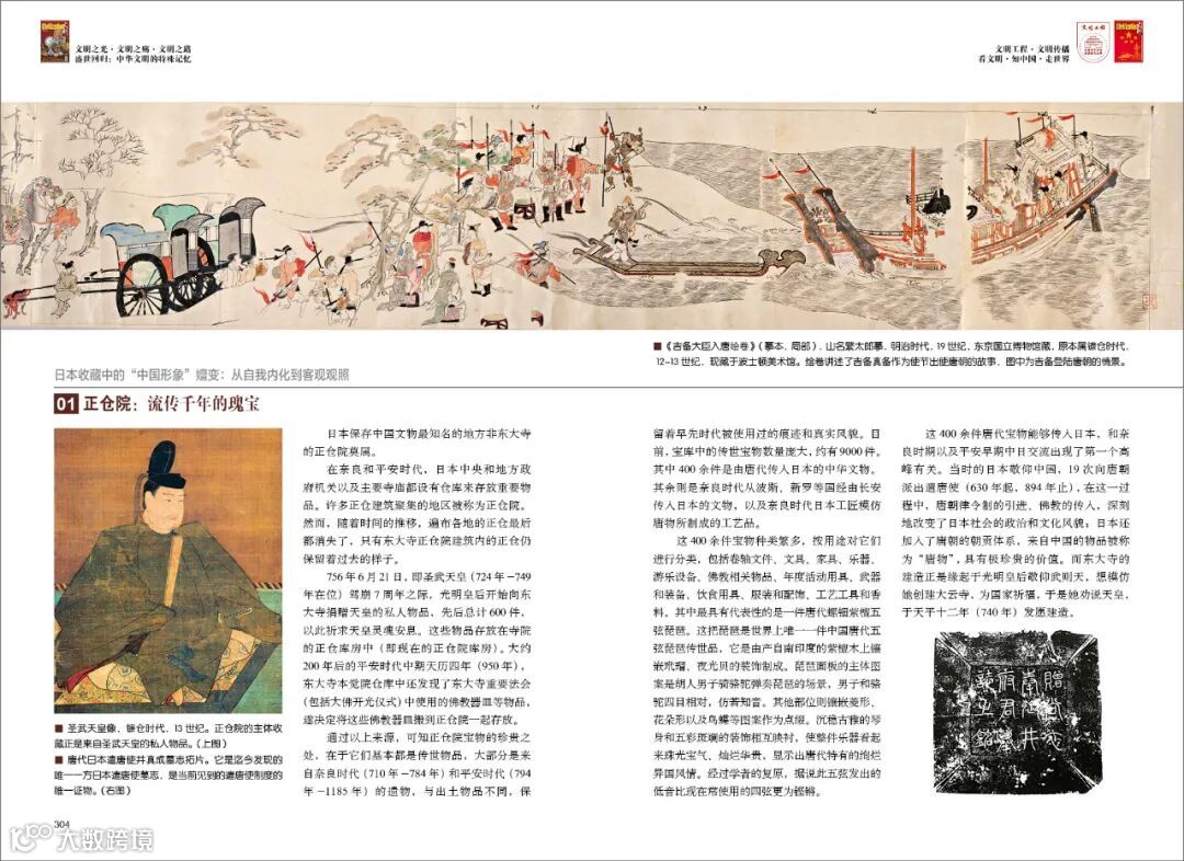 这400余件唐代宝物能够传入日本,和奈良时期以及平安早期中日交流出现了第一个高峰有关。当时的日本敬仰中国,19次向唐朝派出遣唐使(630年起,894年止),在这一过程中,唐朝律令制的引进、佛教的传入,深刻地改变了日本社会的政治和文化风貌;日本还加入了唐朝的朝贡体系,来自中国的物品被称为“唐物”,具有极珍贵的价值。而东大寺的建造正是缘起于光明皇后敬仰武则天,想模仿她创建大云寺,为国家祈福,于是她劝说天皇,于天平十二年(740年)发愿建造。