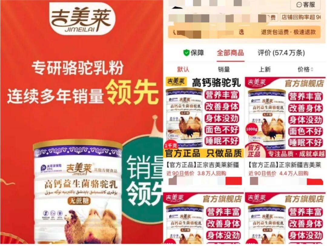 在某电商平台的年度驼奶粉畅销榜上,一款名为“吉美莱高钙益生菌骆驼乳”的产品位居榜首。该产品的销售店铺自称为官方旗舰店,打着官方正品的旗号标榜自身权威。店铺页面用大字号宣传产品具有 “营养丰富、改善身体、身体没劲、面色不好、睡眠不好” 等功效性暗示标语。这款产品售价69.9元一罐,每罐净重1000克,包装整体以西域特色图案和双峰骆驼为背景,宣称“专研骆驼乳粉、连续多年销量领先”,看上去很容易让人感觉这就是货真价实的驼奶粉。