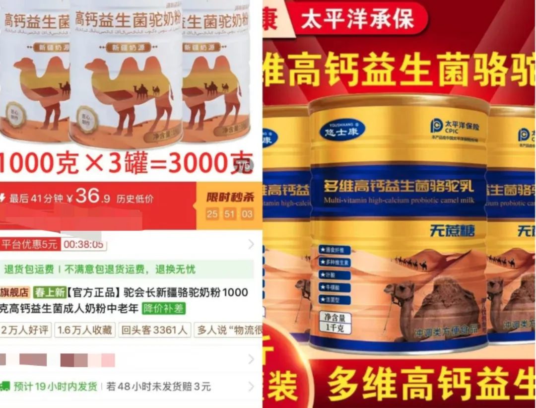 套路一:打着新疆、内蒙古等驼奶知名产区奶源的招牌,号称奶源纯正,适合中老年高钙补充及儿童学生营养需求的产品,实际产地在安徽、江西等地,与宣传不符。而且有生产企业已被注销,产品却仍在电商平台热销;有的企业还曾多次被行政部门处罚。