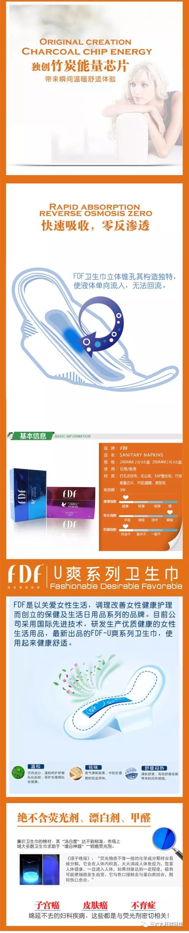 FDF系列卫生巾的棉网膜中镶有竹炭负离子复合能量芯片,在使用中可以发射高浓度的负离子,用纯物理的方法达到调节机能,增强免疫力,消炎抗菌的作用。