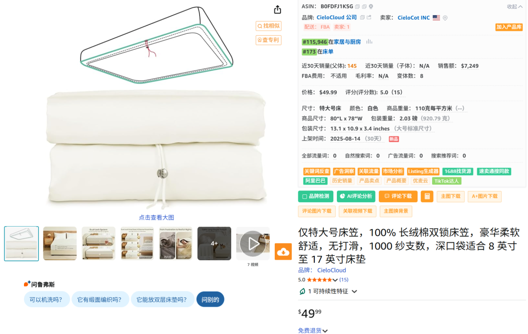 目前#亚马逊 上发现一款#专利改款新品:特大号床笠,100% 长绒棉双锁床笠,豪华柔软舒适,无打滑,1000 纱支数,深口袋适合 8 英寸至 17 英寸床垫