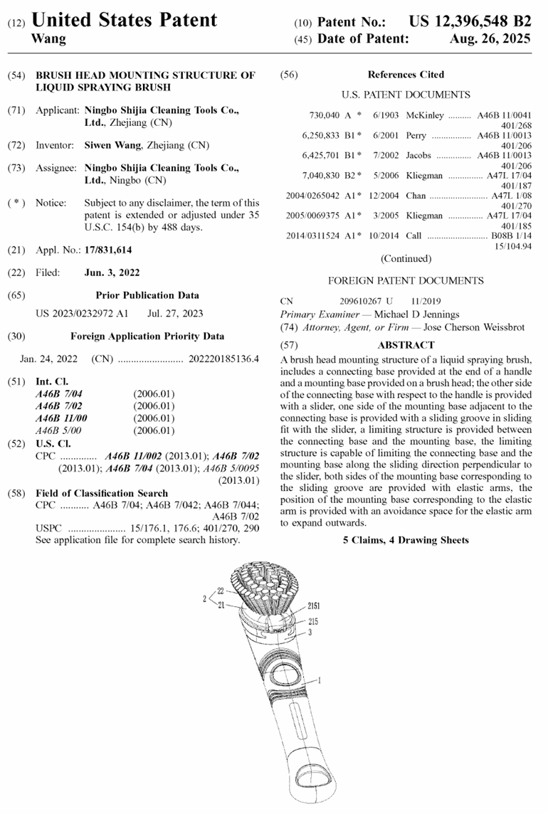 1.一种喷液刷的刷头安装结构,包括:设置在手柄(1)端部的连接座(3)和设置在刷头(2)上的安装座(21),所述连接座(3)相对于手柄(1)的另一侧设有具有两侧的滑块(32),所述滑块(32)的两侧中对应手柄(1)的一侧设有减重槽(323),所述安装座(21)靠近所述连接座(3)的一侧设有与所述滑块(32)滑动配合的滑槽(212),所述滑槽(212)的一端为封闭端(2121),另一端为开口端(2122),所述安装座(21)对应所述开口端(2122)的一侧设有按压部(215),所述按压部(215)从所述安装座(21)向侧面凸出刷头(2)远离封闭端(2121),通过推压按压部(215)使刷头(2)从连接座(3)滑出,从而将刷头(2)从连接座(3)上拆卸下来进行更换,其中,按压部具有光滑曲面,该光滑曲面沿安装座(21)的周向,连接座(3)与安装座(21)之间设有限位结构,该限位结构能够将连接座(3)与安装座(21)沿垂直于滑块(32)的滑动方向限位,安装座(21)对应滑槽(212)的两侧均设有弹性臂(213),安装座(21)对应弹性臂(213)的位置设有供弹性臂(213)向外扩张的避让空间(214),弹性臂(213)的另一侧相对于避让空间(214)设有定位凸起(2131),滑块(32)设有与定位凸起(2131)定位配合的凹槽(321),通过定位凸起(2131)与凹槽(321)的配合,连接座(3)与安装座(21)能够沿滑块(32)的滑动方向限位。