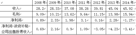 (2008-2014年汇源果汁的收入及利润变化(单位:亿元))