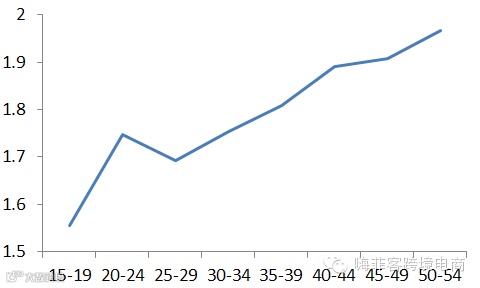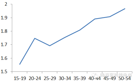 其次,新婚的非独生子女夫妇的生育意愿也在下降。根据2013年CGSS数据,女性按照年龄分的生育意愿如下图(注意坐标底部为1.5)所示,2013年的15至19岁女性,生育意愿仅勉强多于1.5个孩子,这批人进入婚姻后,因「全面两孩」政策而被释放出的生育意愿也会相应减少。