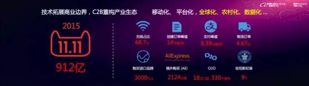 从“双11”展现的数字和场景来看,已经呈现了一个以互联网为基础平台的、全球化的商业生态系统。这是一个典型的、互联网驱动的商业零售业生态系统。不以过去“工业经济结构”去呈现,而以一种相互连接、对等、开放、透明规则的“信息基础结构”体系呈现。在这个经济体中,卖家、买家、服务商、平台、政府,各方参与进来共同发展新商业和新制造业。“双11”当天,达到很多高点,其中,当天移动用户下单购买商品的占有68.7%,技术在不断拓展商业边界。消费者驱动的一个逆向的对销售、对零售的倒逼正在发生。