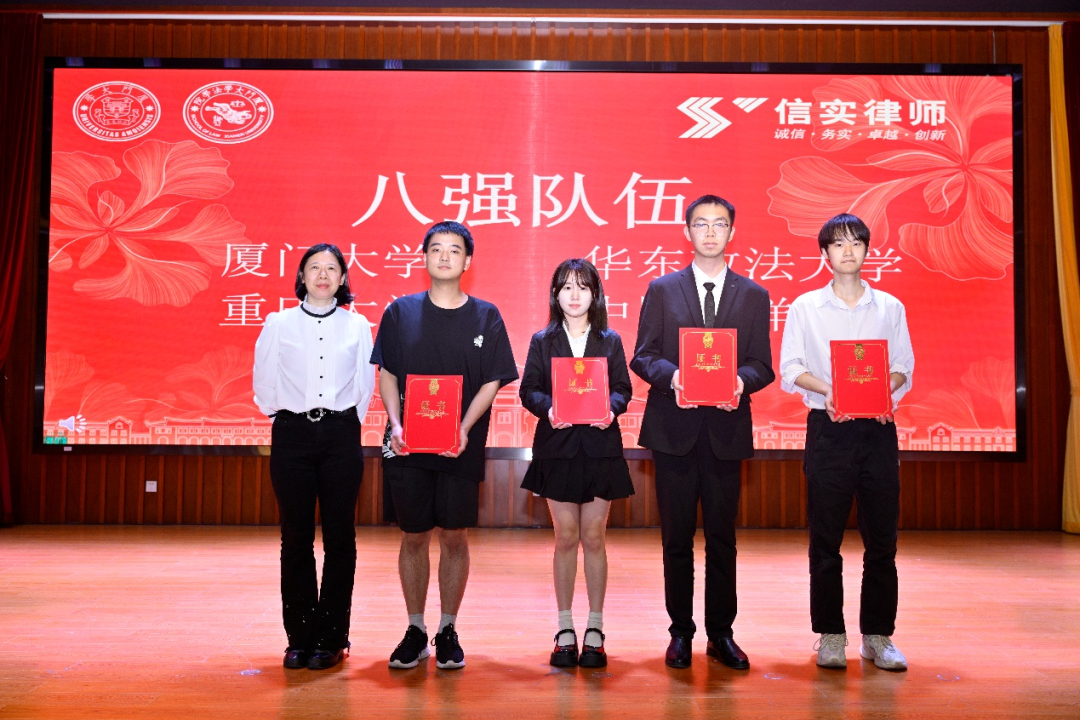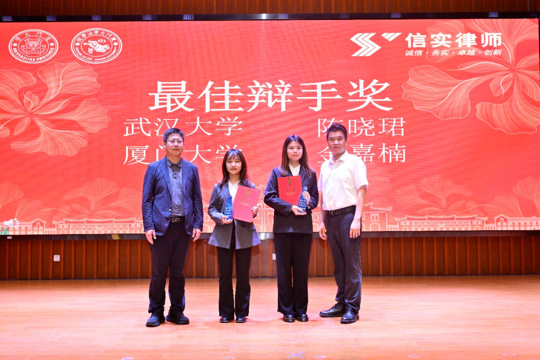 厦门大学法学院党委书记何丽新宣读了获奖名单。秦陈希菱、吴天宇等来自各高校的30名同学荣获优秀辩手奖;来自武汉大学的陈晓珺和来自厦门大学的金嘉楠同学凭借在赛场上的卓越表现,斩获最佳辩手奖;浙江大学和中国人民大学的参赛团队获得最佳书状奖;厦门大学、重庆大学、华东政法大学和中国海洋大学进入八强;中国人民大学和福建师范大学获得季军;中南财经政法大学获得亚军;冠军则由武汉大学收入囊中。