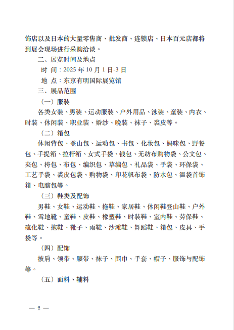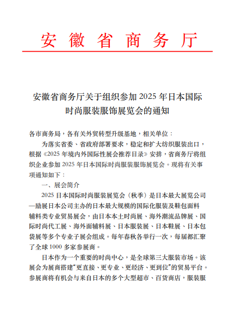 2025日本国际时尚服装展览会(秋季)是日本最大展览公司——励展日本公司主办的日本最大规模的国际化服装及鞋包面料辅料类专业贸易展会,由日本本土时尚展、海外潮流品牌展、国际时尚代工展、海外面辅料展、日本服装展、日本鞋展、日本包袋展等多个专业子展会组成。每年春秋各举行一次。