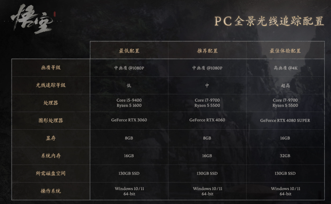 《黑神话:悟空》对处理器和内存的要求都不高,最低配置下只要求i5-8400或者锐龙5 1600,4K最高画质也只需要i7-9700或者锐龙5 5500。