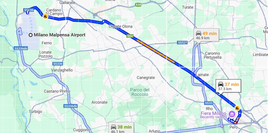 马尔彭萨机场(Malpensa)至展馆,出租车程约40分钟