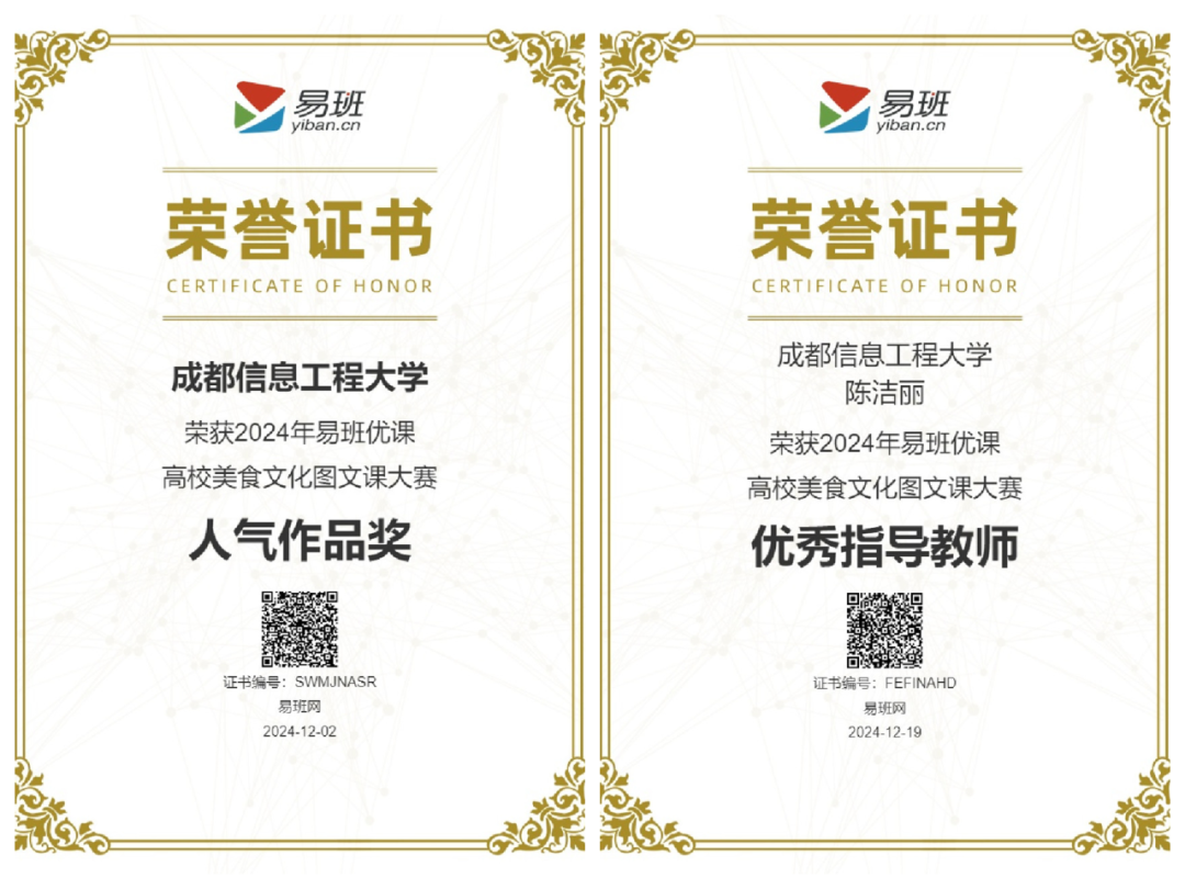 在全国易班网“2024年高校美食文化图文大赛课群比赛”活动中,学校荣获“人气作品奖”,易班指导教师荣获优秀指导教师荣誉;