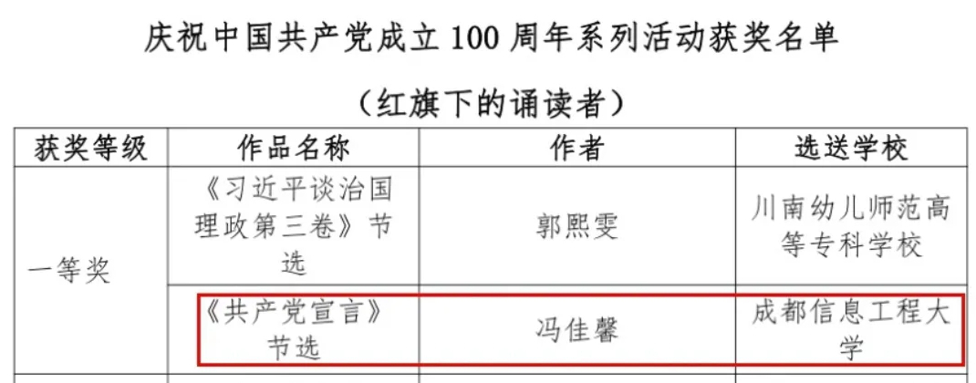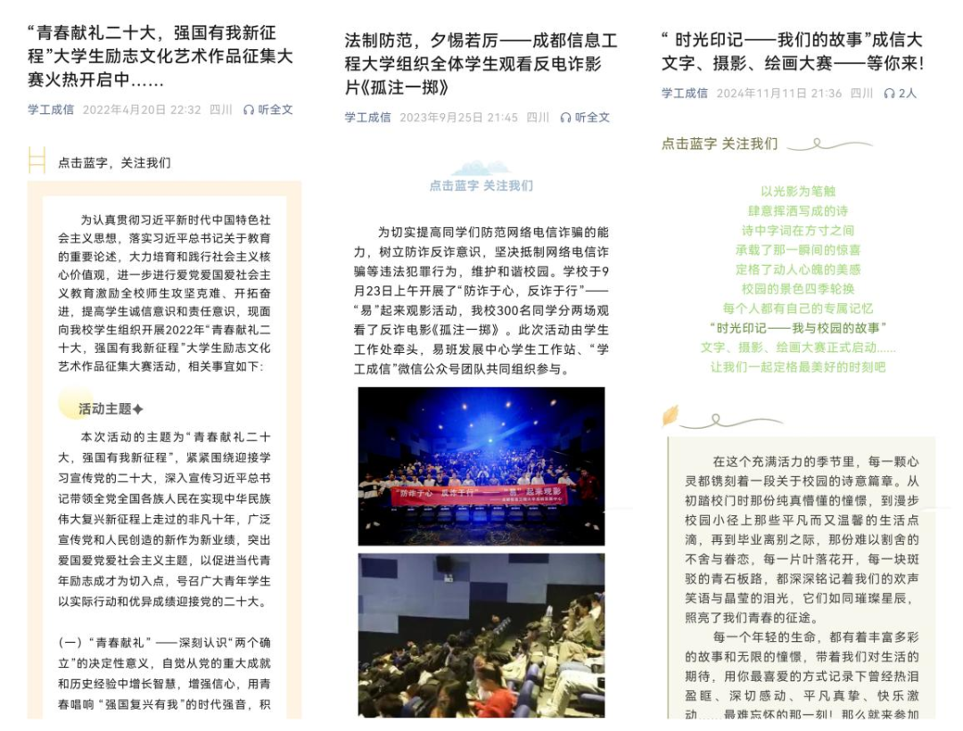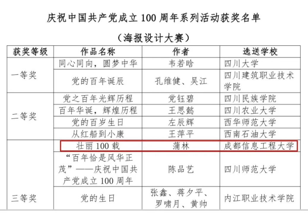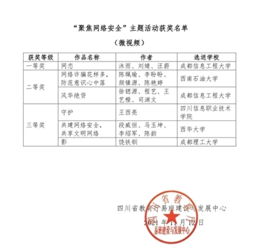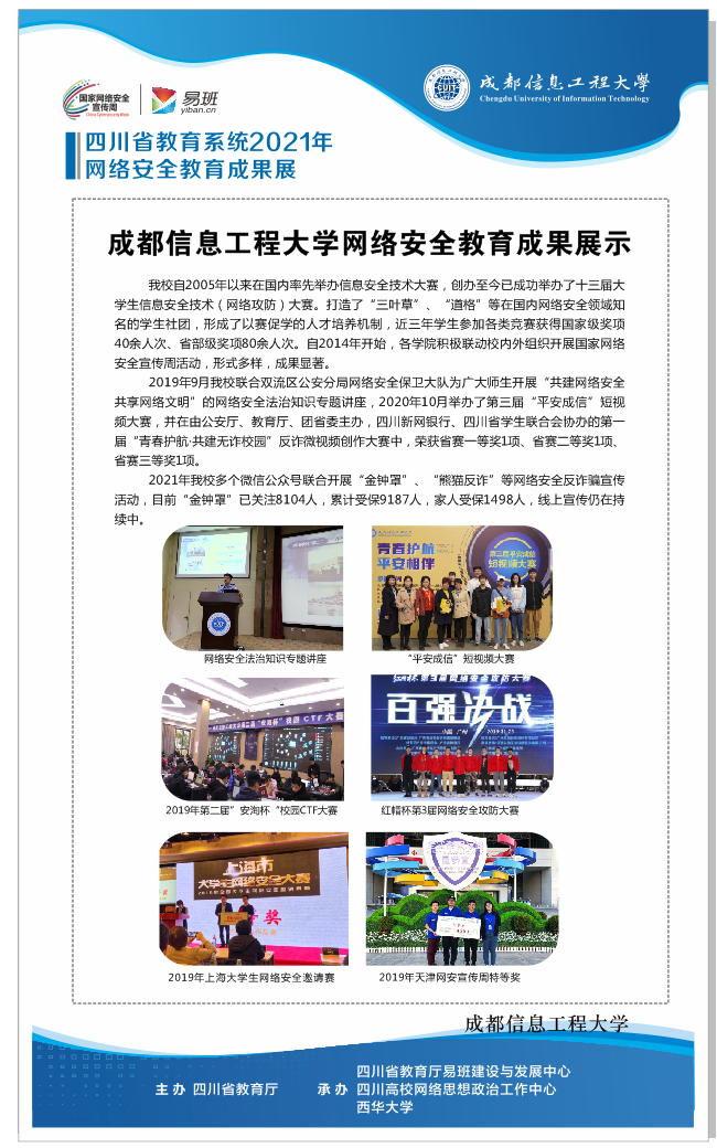 在四川省易班发展中心开展的“庆祝中国共产党成立100周年系列活动”、“聚焦网络安全”主题活动、“青春无邪 法典相伴”文艺作品展播、“易青春.五四青春榜样”评选等活动中获得多项荣誉;我校师生胡全、尹博文荣获五四青年教师榜样、学生榜样荣誉称号;