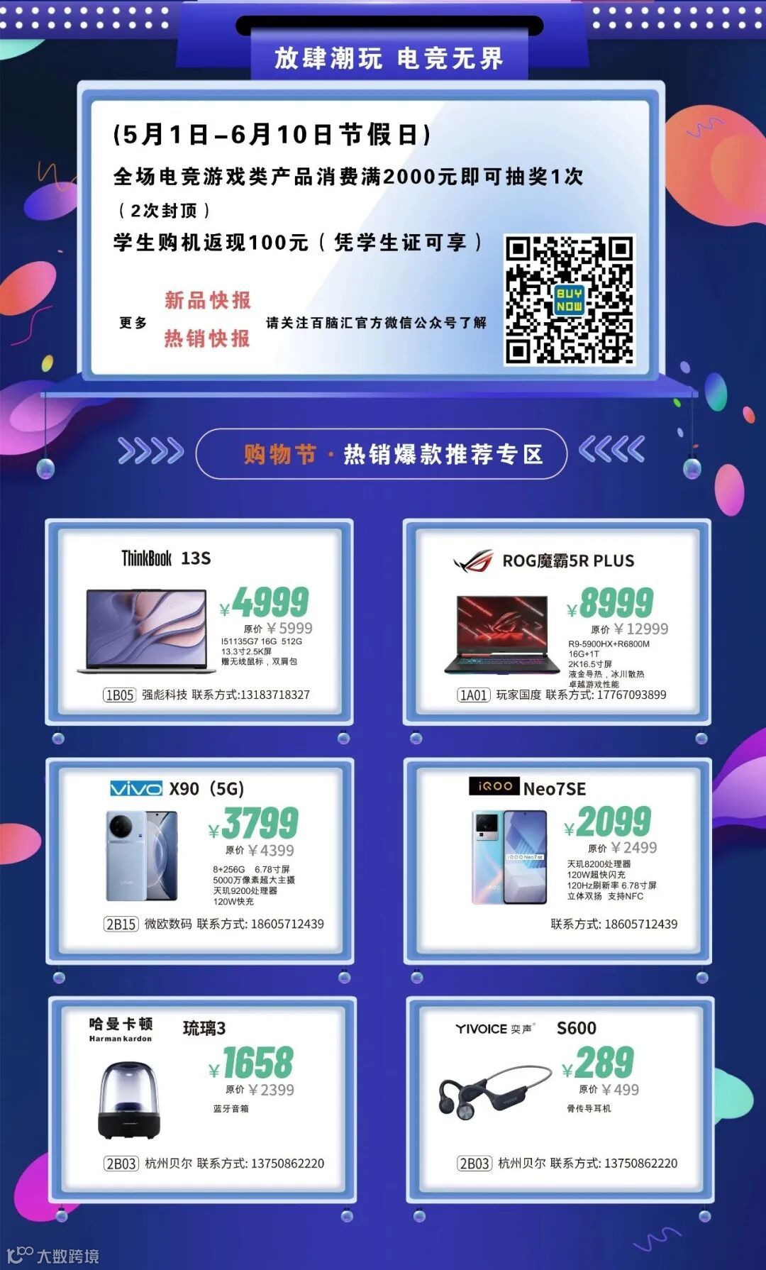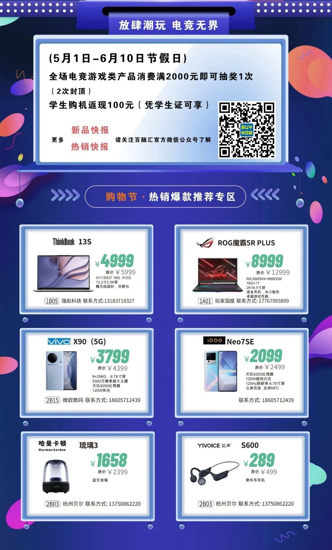 从5月1日起,至6月10日,凡到百脑汇杭州店购买电竞游戏类产品,全场消费满2000元,即可抽奖1次,一人可抽2次奖。同时,学生购机,凭学生证还能返现100元,优惠、福利双重享有!