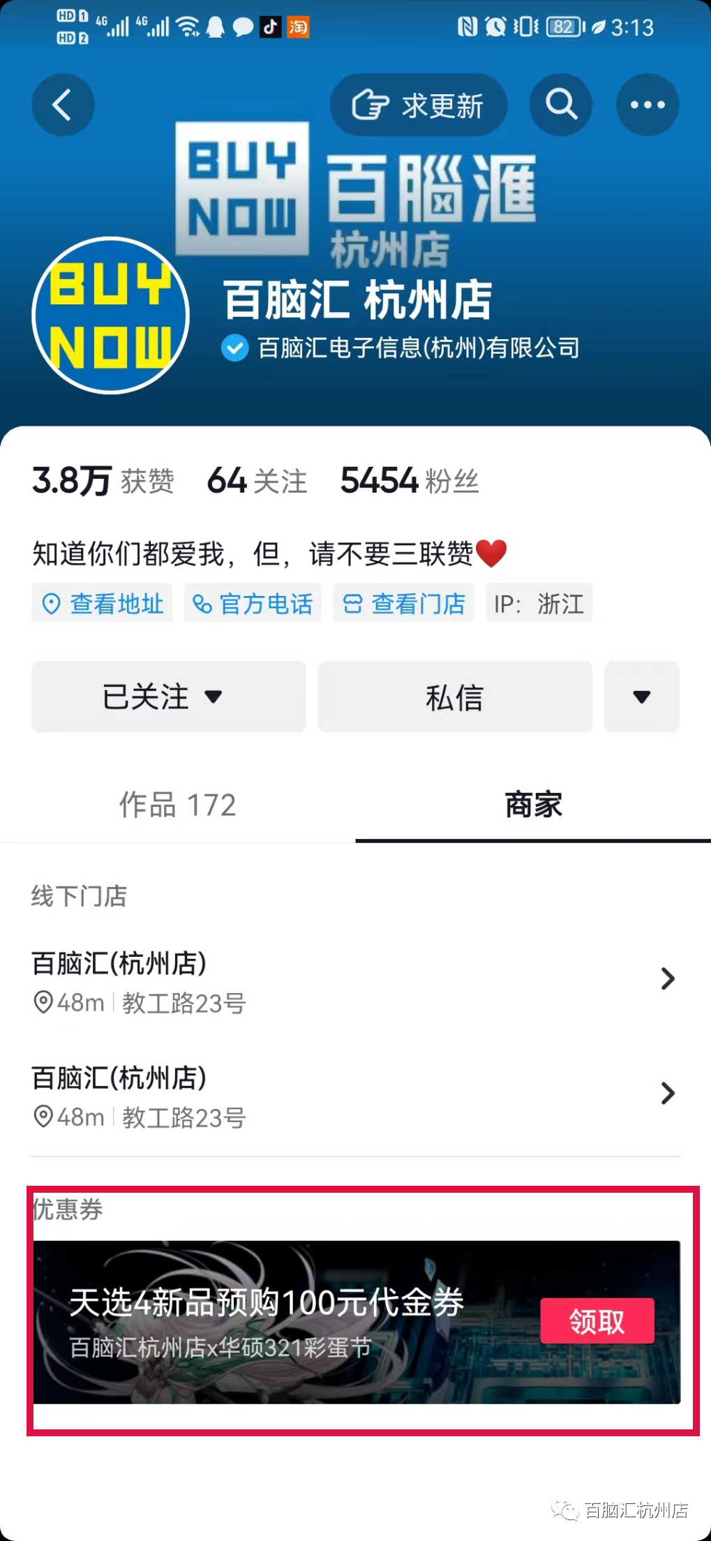 抖音搜索“百脑汇杭州店”
