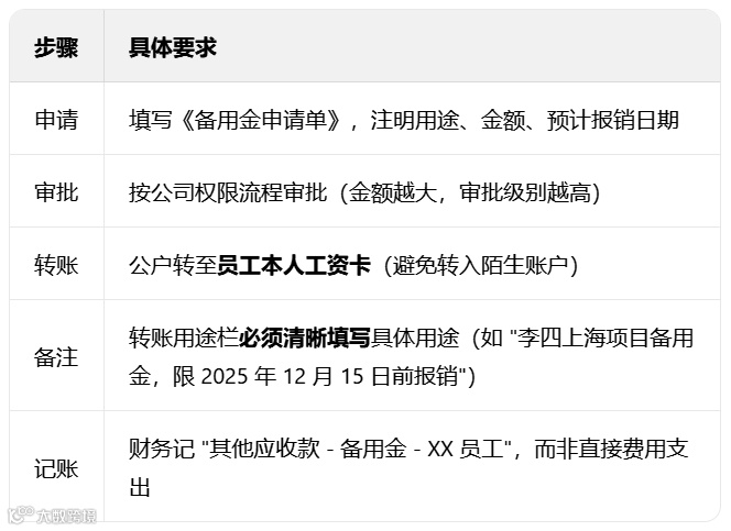- 收款人为员工且用于公务(如出差预支),备注“备用金”合规;