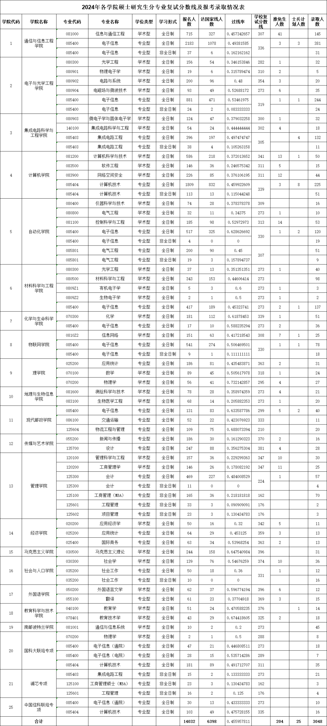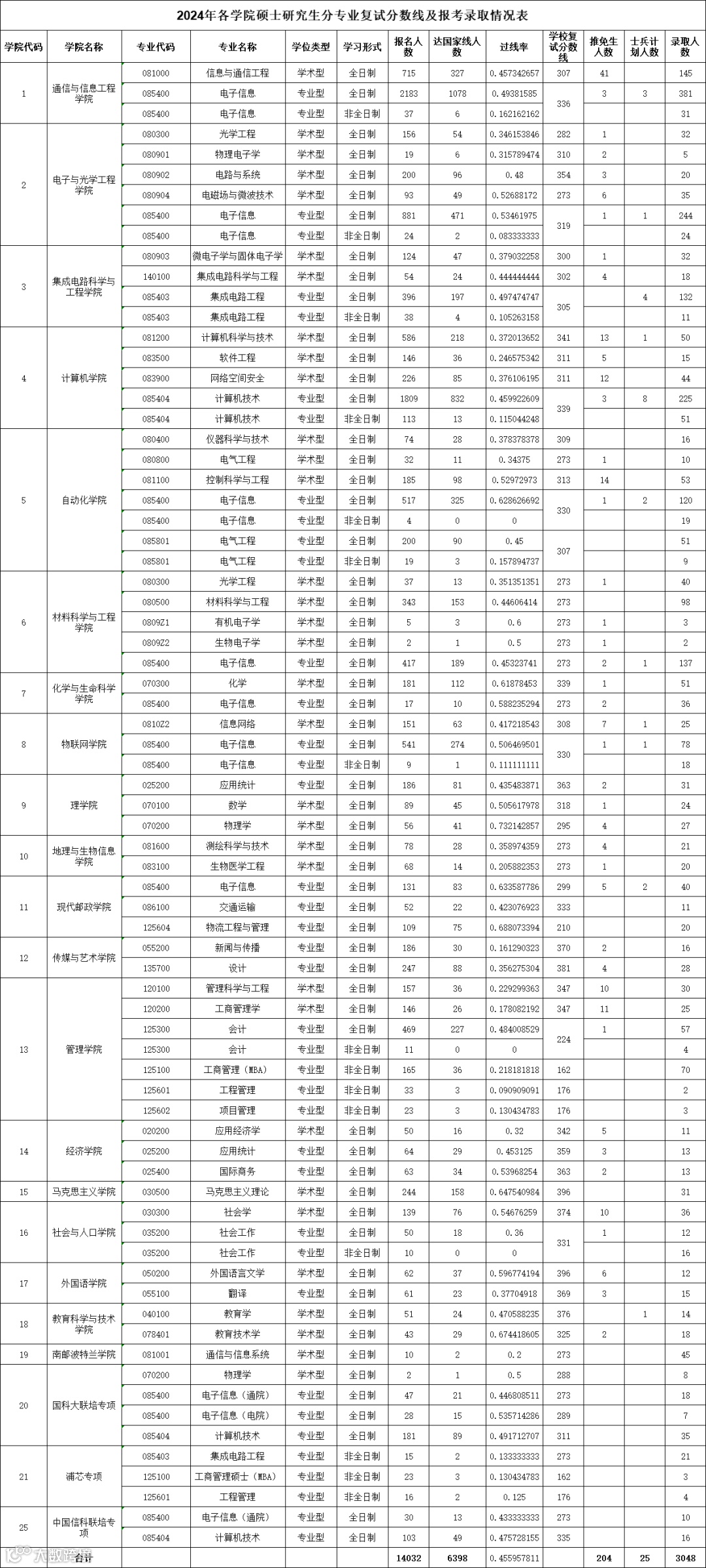 在24考研中,南京邮电大学吸引了14032人报考,其中6398人通过国家线,过线率约为46%,相对友好。