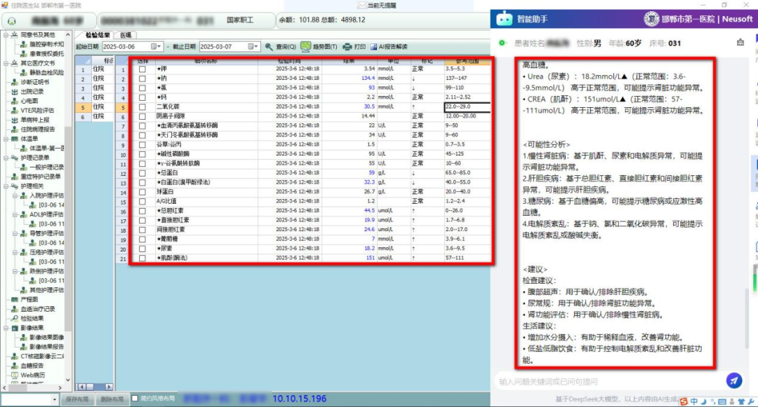 功能简介:AI自动解析检验报告,识别关键异常指标,关联临床意义与处置建议。