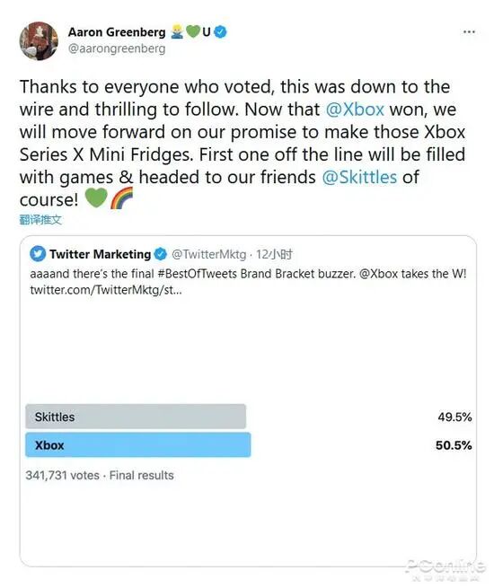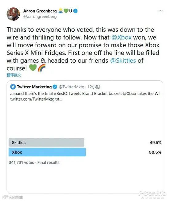 Aaron Greenberg在推文中表示:非常感谢大家的投票,现在Xbox已经赢得推特最具影响力品牌投票,我们决定履行诺言,将正式投产“Xbox Series X迷你冰箱”。显然,迷你冰箱比此前2米多高的单开门冰箱制造难度要低得多,价格也可以做到多数人接受,喜欢的朋友不妨耐心等待微软履行诺言吧。