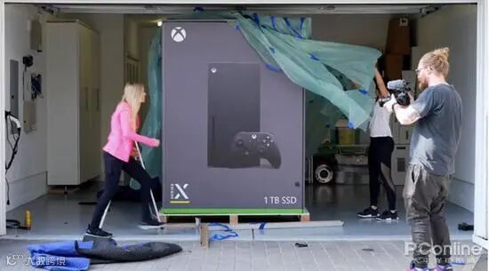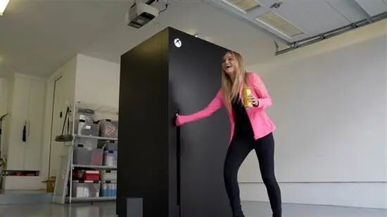 甚至在Xbox Series X/S主机发售前夕,微软真的造出了一个真人大小的XSX造型冰箱,又能成功收割一波热度。当时,坐拥百万粉丝的女主播iJustine还特定搞了开箱,引发一阵轰动。通过开箱视频,我们可以看到这个冰箱真的是完全还原了Xbox Series X主机的造型:前面有Xbox的logo,通上电之后logo变亮。甚至,当你打开冰箱门之后,会听到标志性的XSX开机声。打开之后,内部亮的灯也是Xbox标志性的绿色。但这个XSX冰箱它太大了,以至于视频中的国外博主iJustine都关不上车库的门。