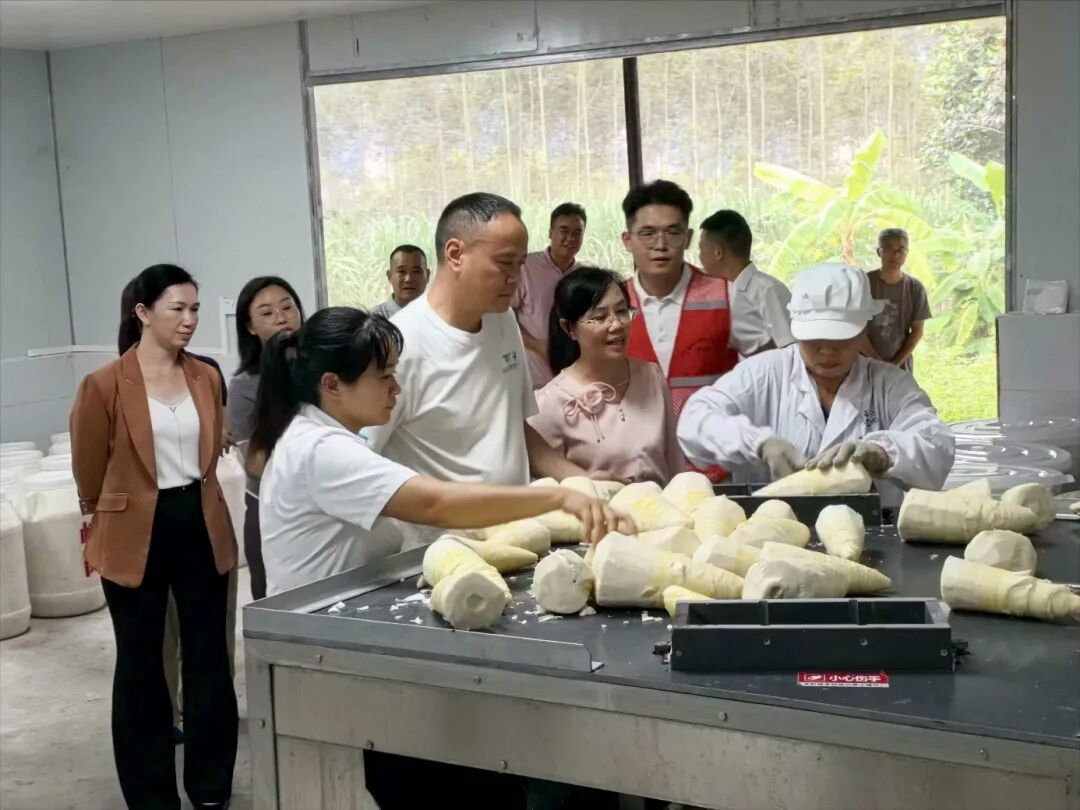 随着柳州螺蛳粉爆火出圈,柳州市螺蛳粉行业对优质酸笋原材料的需求持续增长。在市领导牵线搭桥下,崇左市政府办迅速对接柳州市政府办,共同搭建跨区域供需对接桥梁。今年8月中旬,柳州市政府分管副秘书长率柳州市螺蛳粉产业发展中心、柳州市螺蛳粉协会以及广西蒙方兴农业有限公司在内的多家企业组成考察组到峡岗村开展实地考察,为村企批量合作寻找契合点。