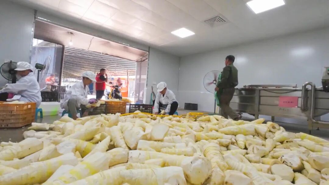 ▲在峡岗村竹笋加工厂,工作人员正在对竹笋进行分拣。