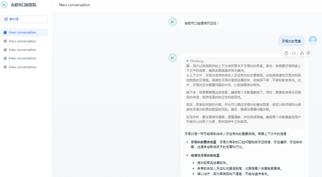为响应国家关于促进人工智能与医疗健康深度融合的战略部署,合肥市口腔医院积极探索人工智能技术在口腔医疗领域的创新应用。近日,医院成功完成 DeepSeek1.5b的本地化部署,成为市属医疗机构中首批实现这一突破的单位,致力于为患者和医护人员提供更智能、高效、精准的医疗服务。