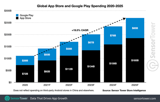 苹果或将会成为最大受益者。未来五年内,App Store 的全球年营收预计将达到 1850 亿美元,Google Play年营收也会增至 850 亿美元。