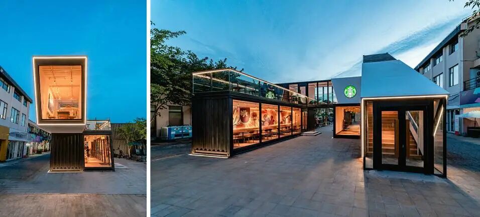 该门店由六个大小不同的集装箱创意拼搭在一起,错落有致的堆叠出特有的结构感与韵律感。