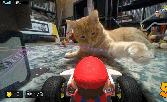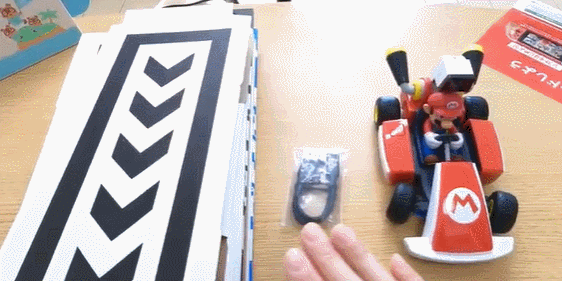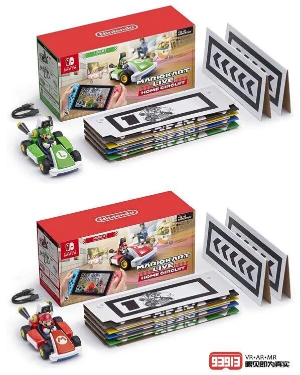 《马里奥赛车Live:家庭巡回赛》的游戏套装里包含了一辆马里奥或者路易吉遥控赛车、一根USB-C转USB-A的充电线、两个指示方向用的纸板(可以在游戏中通过AR动画来提示转弯方向)、四个折叠纸板门(用于赛车识别赛程和起点终点)。纸板门可以放置在遥控赛车信号范围内的任何位置,需要进行固定,因为稍有扭曲就可能会让AR追踪无法识别。