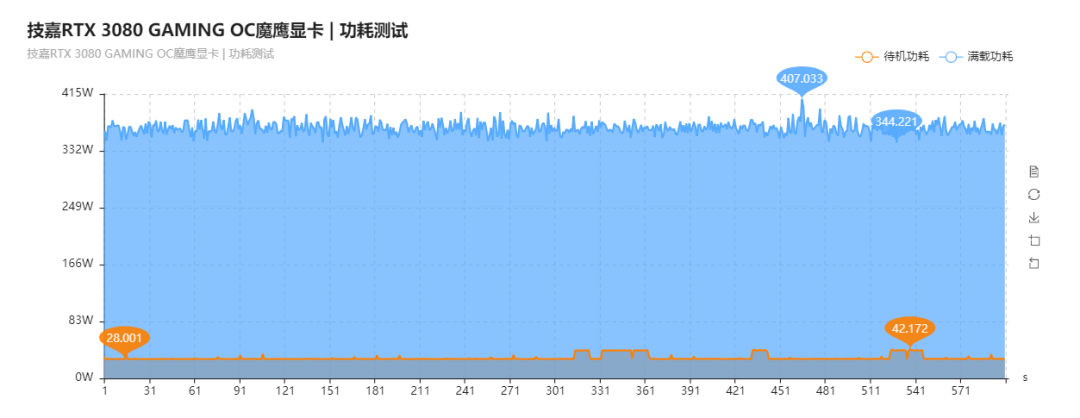 这里借助NVIDIA提供的PCAT工具,可以精确测量显卡PCI-E与外接电源接口的实际功率。显卡满载功耗在3DMark Time Spy Extreme压力测试中获得,可以看出,技嘉RTX 3080 GAMING OC魔鹰显卡的满载平均功耗为365W,峰值功耗则为407W,待机平均功耗则是28W左右。