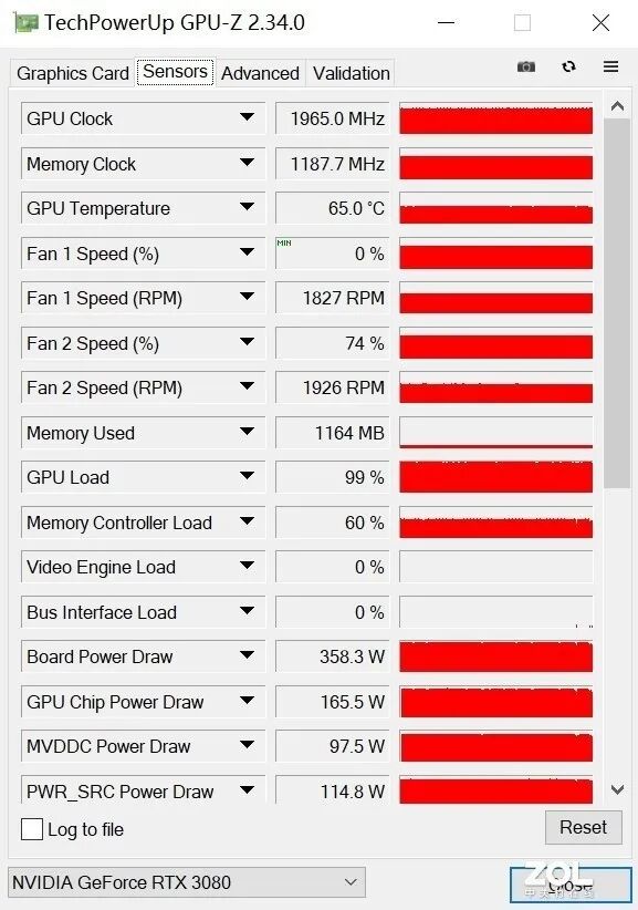 甜甜圈拷机的情况下技嘉GeForce RTX 3080 GAMING OC 10G魔鹰的单卡功耗达到358W,风扇来到了近2000转,而温度却只有65℃。