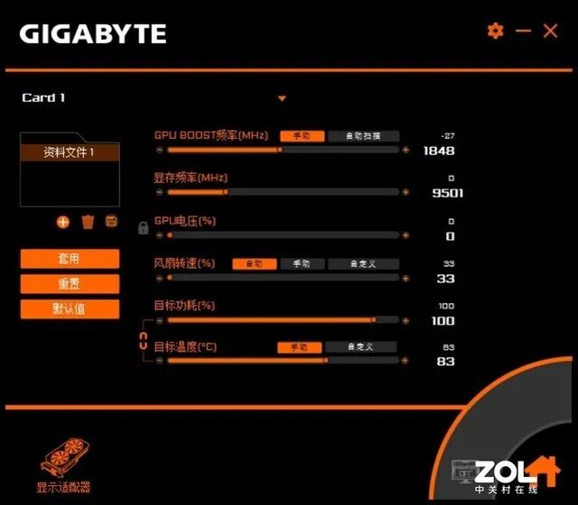 同时不要忘了显卡支持风扇智能启停等散热技术,温度不到设定值,风扇不转的。如果有特殊需求,也可以使用AORUS Engle软件,打造属于自己的模式,手动调整风扇策略。