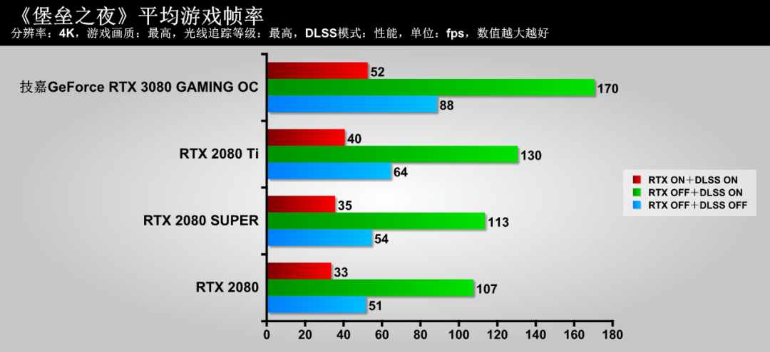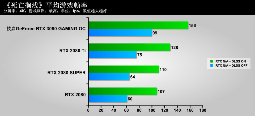 游戏方面我们参考《死亡搁浅》和《堡垒之夜》,结果显示技嘉GeForce RTX 3080 GAMING OC魔鹰同样能够大幅领先RTX 2080和RTX 2080 SUPER显卡,特别是在4K分辨率下的游戏帧数,表现尤为突出。