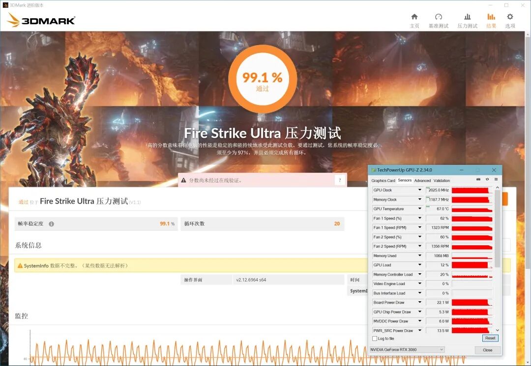 这里我们使用3DMark的FireStrike Ultra进行压力测试时,技嘉GeForce RTX 3080 GAMING OC 10G显卡的峰值频率可以达到2025MHz,并且以99.1%的成绩通过测试(97%为合格),稳定使用完全不必担心。而风扇转速也只有1300转,温度压到了67℃,几乎没什么感觉。