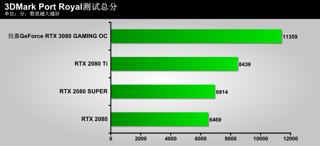 技嘉GeForce RTX 3080 GAMING OC魔鹰的3DMark Port Royal(检验显卡光线追踪理论性能)测试总分达到11359分,领先RTX 2080约76%,即使面对上一代旗舰级显卡RTX 2080 Ti,技嘉GeForce RTX 3080 GAMING OC魔鹰也领先达28%。