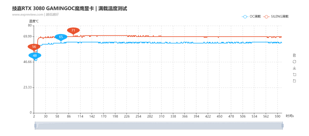 而待机温度方面,大约是在45℃到50℃之间,使用OC模式下,温度可以稳定在65℃,静音模式因为风扇转速有进行调控,温度稳定在70℃。