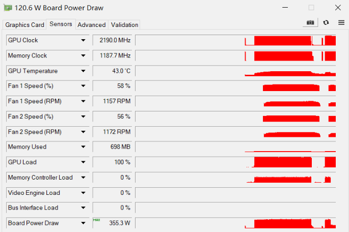 使用技嘉的AORUS Engle软件将显卡频率超频到2190Mhz,单卡功耗为355W,风扇转速1200左右,温度方面只有43℃,性能与温度兼顾,可以说是非常的舒服。