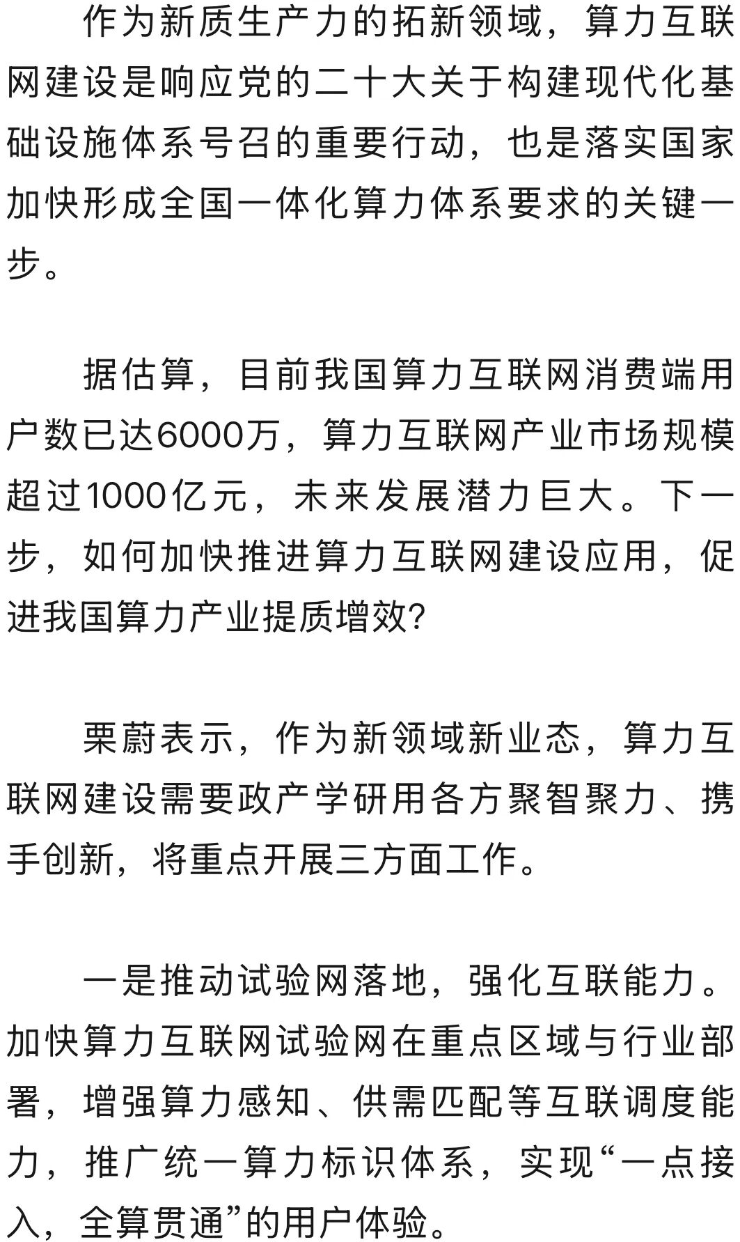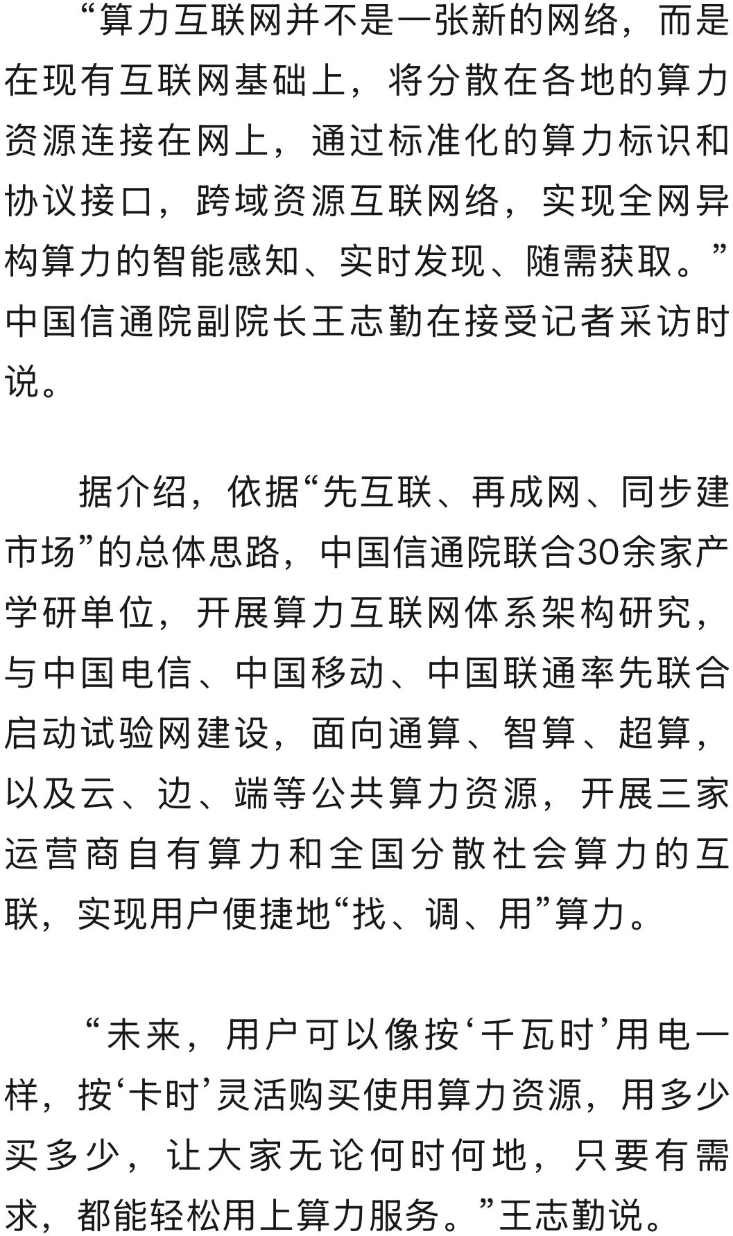 作为算力“国家队”,基础电信企业在算力互联网建设运营中将发挥重要作用,兼具算力服务商、算力互联网运营商、资源提供商等多重角色。“基础电信企业在超大规模算力并网、算网大脑融合调度等方面已有一定积累,积极参与支撑算力互联网建设责无旁贷。我们将发挥自身优势,有效支撑全国算力统一调度和要素高效流通,助力算力服务向集约化、普惠化发展。”中国移动云能力中心副总经理孙少陵告诉记者。