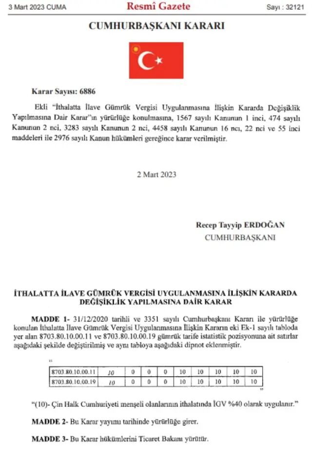 根据土耳其官方公报中的总统决定,对中国生产的电动汽车征收40%的关税。据悉,许多国家汽车进口的税率为10%左右,土耳其此举远高于世界平均水平。