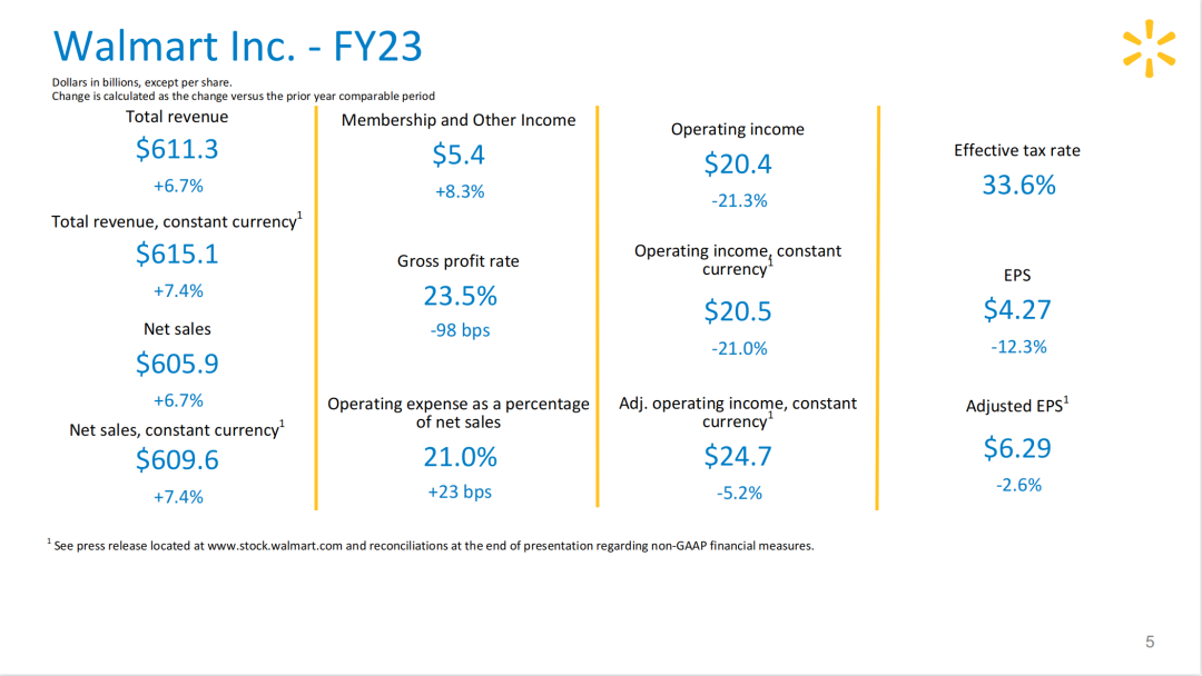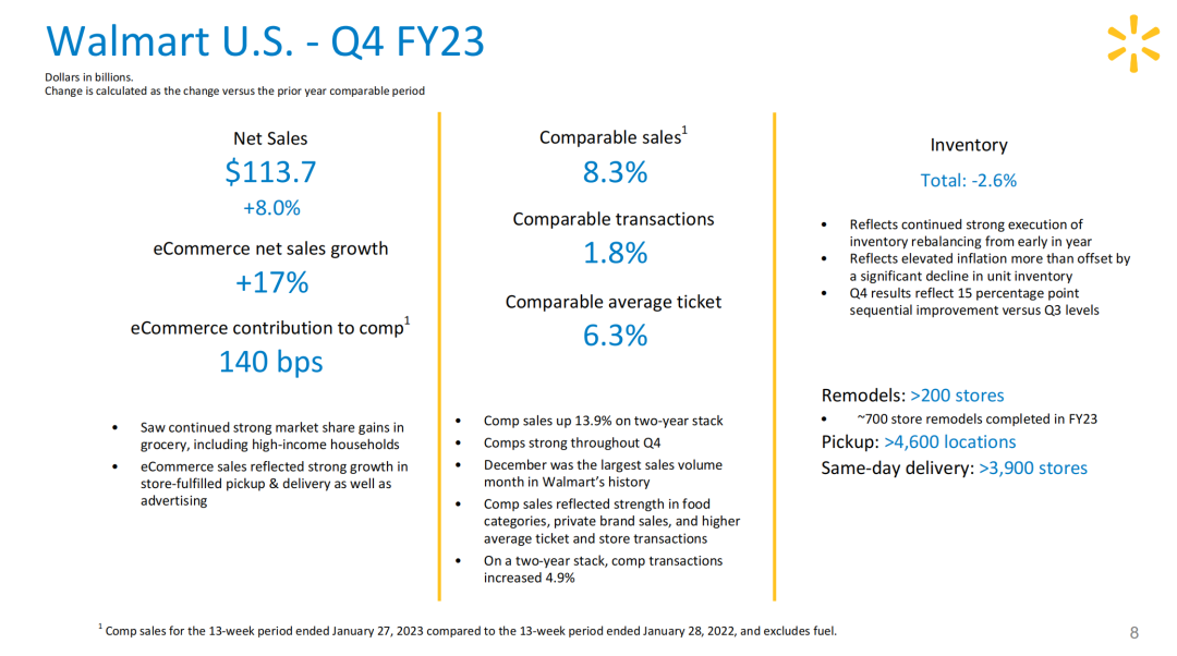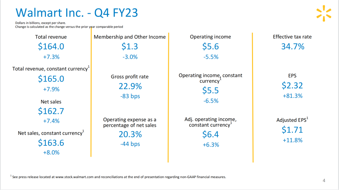 2023财年第四财季,沃尔玛门店和电商业务表现强劲,总营收达1640亿美元,同比增长7.3%,高于市场预期;归属于母公司股东的净利润为63亿美元,同比增长76.2%;第四季度调整后每股收益为1.71美元,高于市场预期。