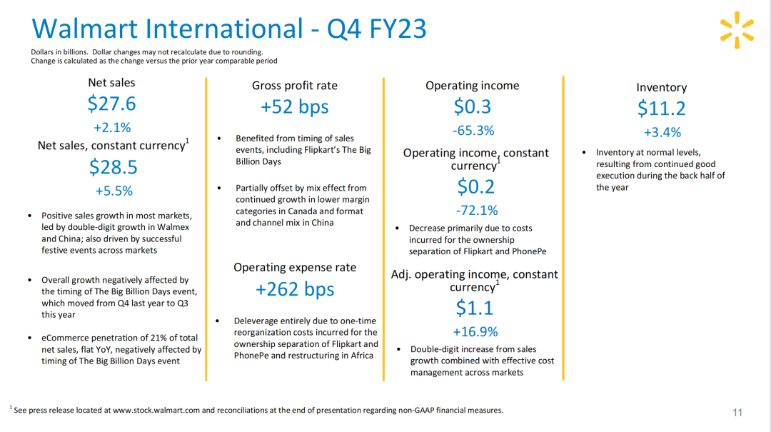 在中国市场方面,沃尔玛中国第四财季净销售额增长13.5%,可比销售额增长13.3%。山姆会员商店和电商业务持续表现出色,并且沃尔玛大卖场业绩有所提升。第四财季电商净销售额占沃尔玛中国总净销售额的48%,增长率为70%。