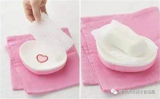 四、垫肥皂。肥皂盒的漏水孔很容易被堵住,肥皂放在这样的皂盒里就相当于在"洗澡"。我们可以把泡沫网套放在肥皂盒底部,让肥皂躺在泡沫网套中就可以控水了。
