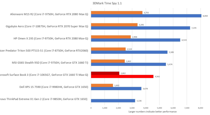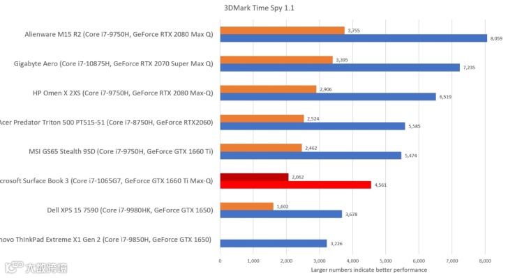 显卡方面,外媒用3DMARK进行了跑分,数据显示GTX 1660 Ti Max-Q位于移动版的GTX 1660 Ti和GTX 1650之间。