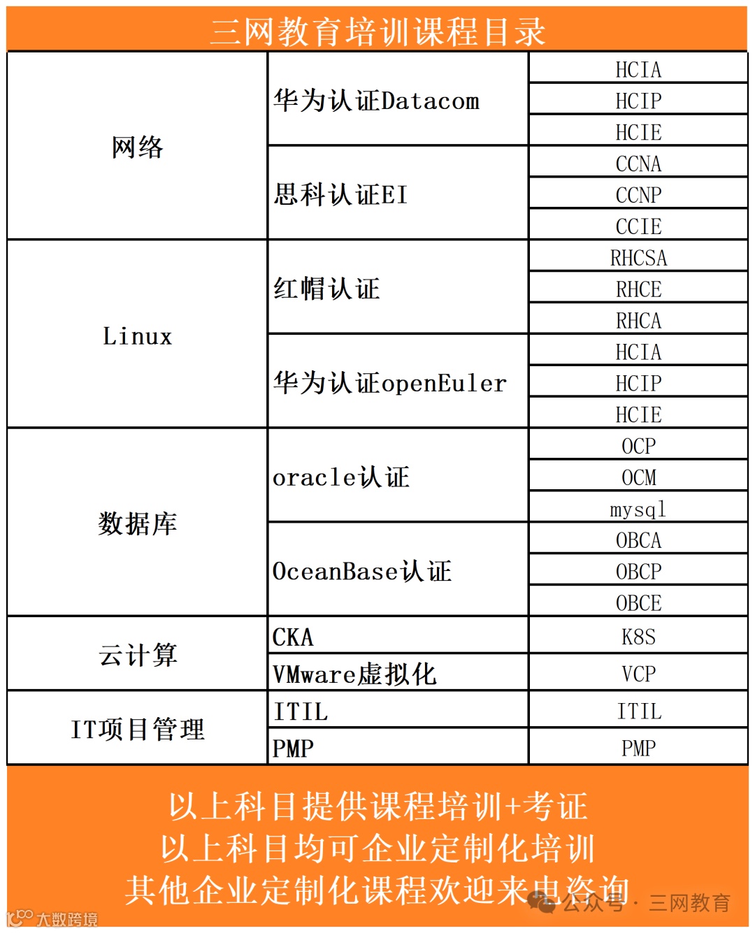 三网携手业界顶尖的技术厂商,签约多名资深技术专家提供专业IT认证课程,我们拥有HCIE/CCIE/RHCA/OCM讲师,项目经验和授课经验丰富,致力于帮助学员和企业有效提升自身竞争力。