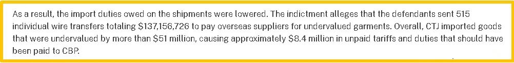 从中国等地采购服装后,515次‘创意报关’,把商品价值“对半砍”,试图让840万美元关税凭空消失,涉案金额高达1.37亿美元!累计低报货值达5100万美元,规模之大令人震惊!