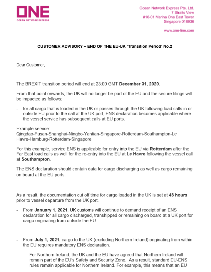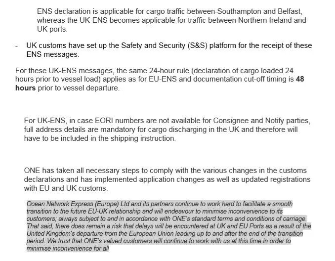据此船公司ONE日前发布公告关于英国脱欧相关安全申报注意事项: