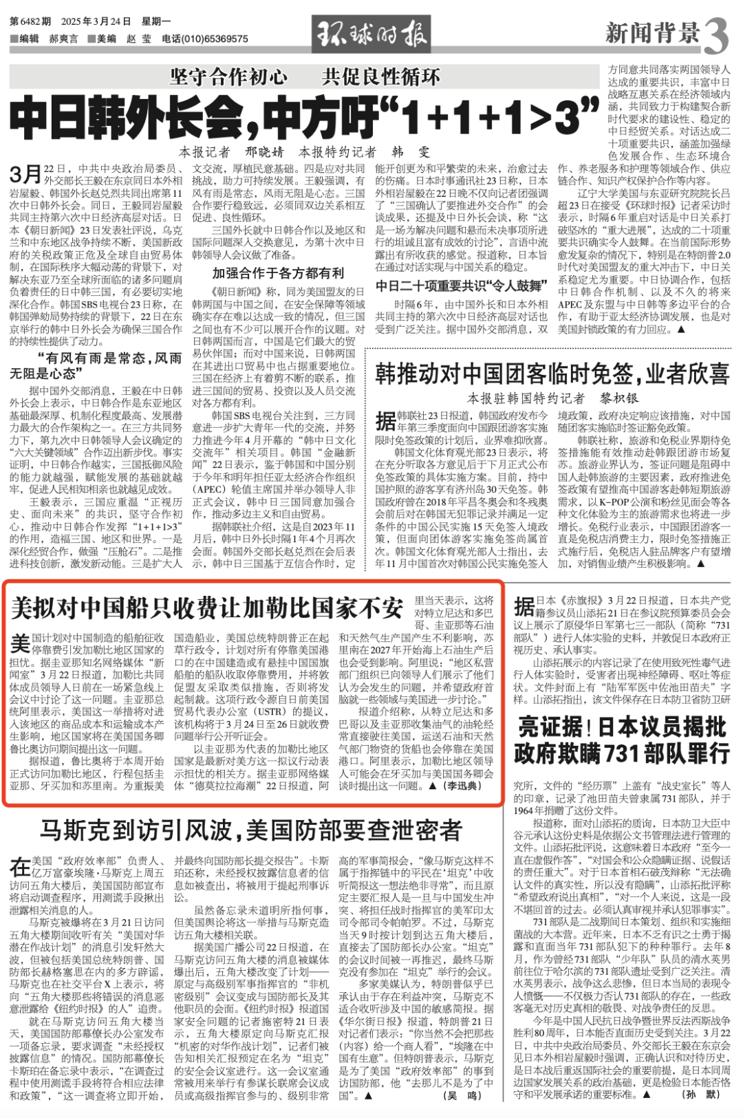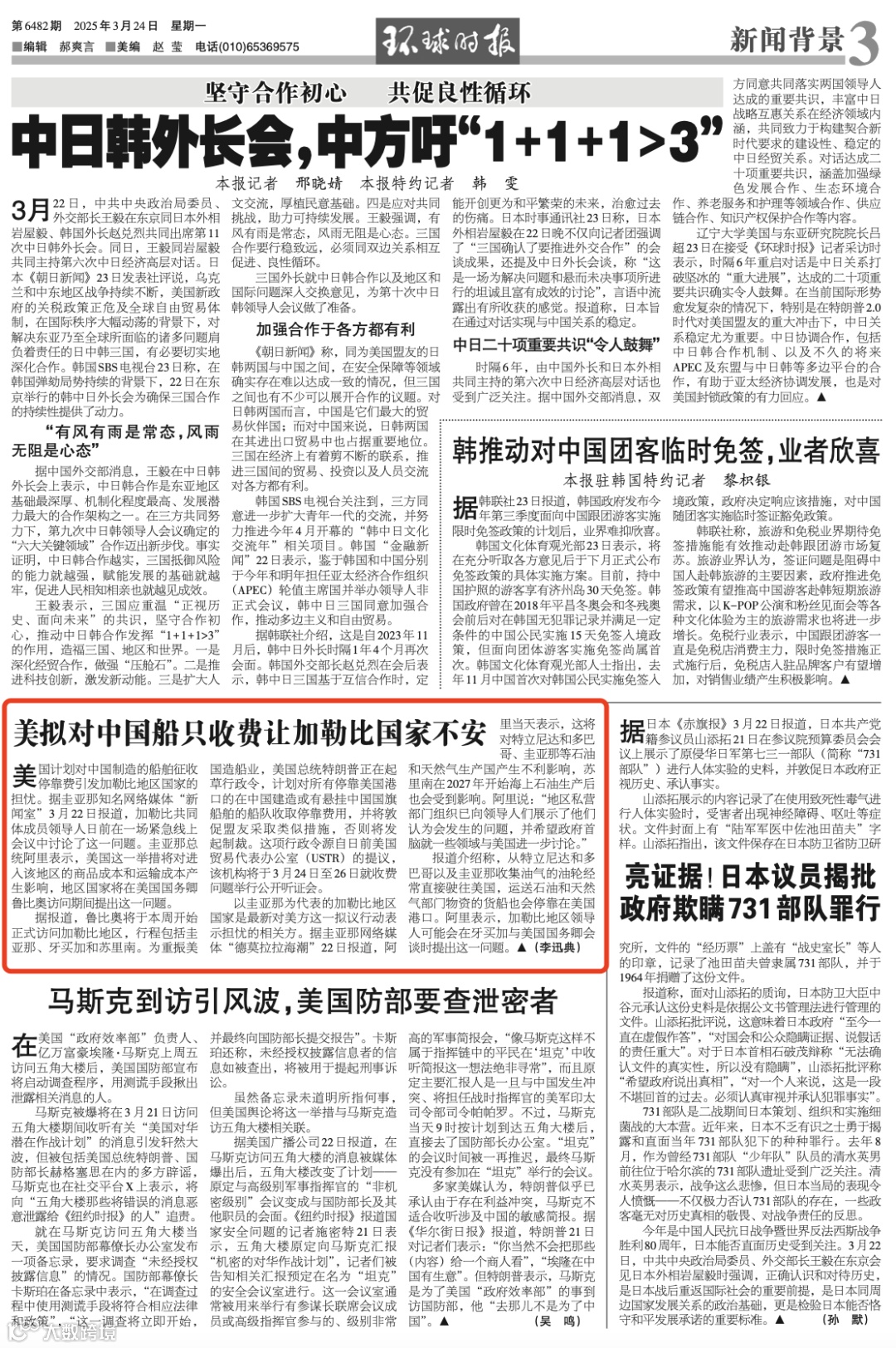 据报道,鲁比奥将于本周开始正式访问加勒比地区,行程包括圭亚那、牙买加和苏里南。为重振美国造船业,美国总统特朗普正在起草行政令,计划对所有停靠美国港口的在中国建造或有悬挂中国国旗船舶的船队收取停靠费用,并将敦促盟友采取类似措施,否则将发起制裁。这项行政令源自日前美国贸易代表办公室(USTR)的提议,该机构将于3月24日至26日就收费问题举行公开听证会。