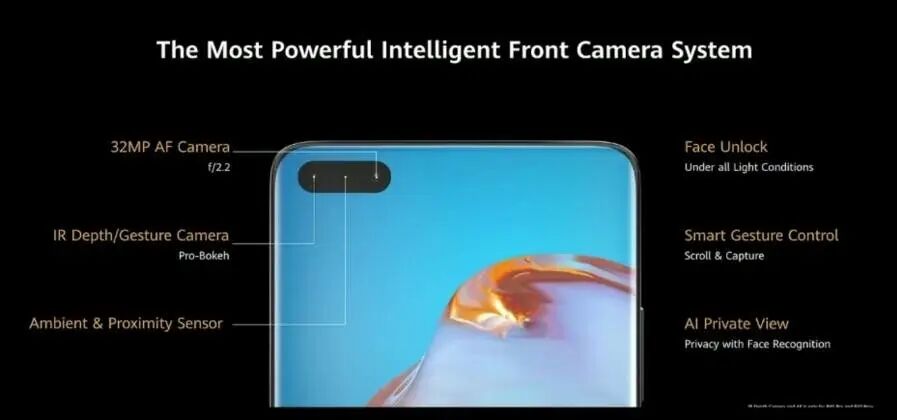 根据余承东介绍,P40 系列全系搭载 3200 万像素前置镜头、红外深度镜头和环境光传感器,其中前置摄像头最高支持 4K 画质视频拍摄,并加入了 AI 拍照优化;红外景深镜头的作用是实现人脸识别、手势动作识别和人脸观看不熄屏功能。